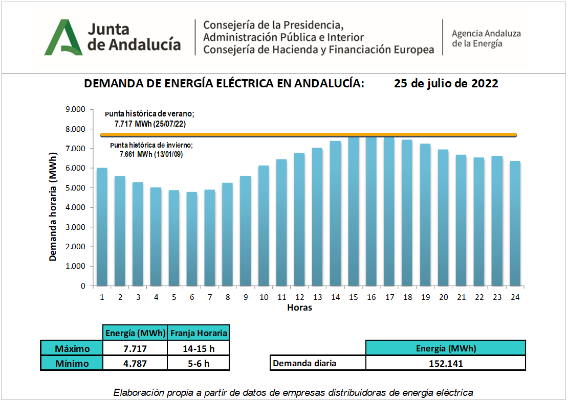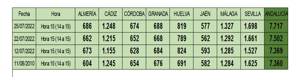 Así, según constata la Agencia Andaluza de la Energía, el pasado 25 de julio entre las 14.00 y 15.00 horas se consumieron 7.717 MWh (megavatios hora), un 4,9% más respecto a los 7.360 MWh que se registraron el 11 de agosto de 2010 en la misma franja horaria, y que ha supuesto que se hayan rebasado en un 8% las previsiones de demanda eléctrica recogidas en el Plan de Verano de garantía de suministro eléctrico 2022.